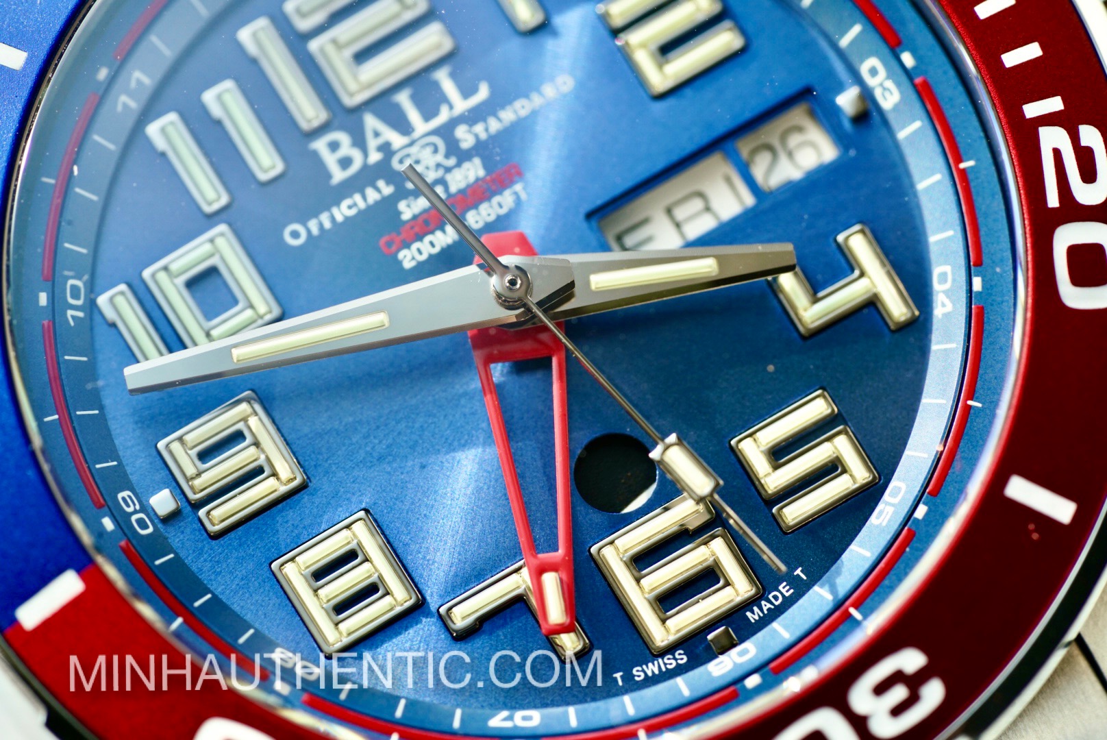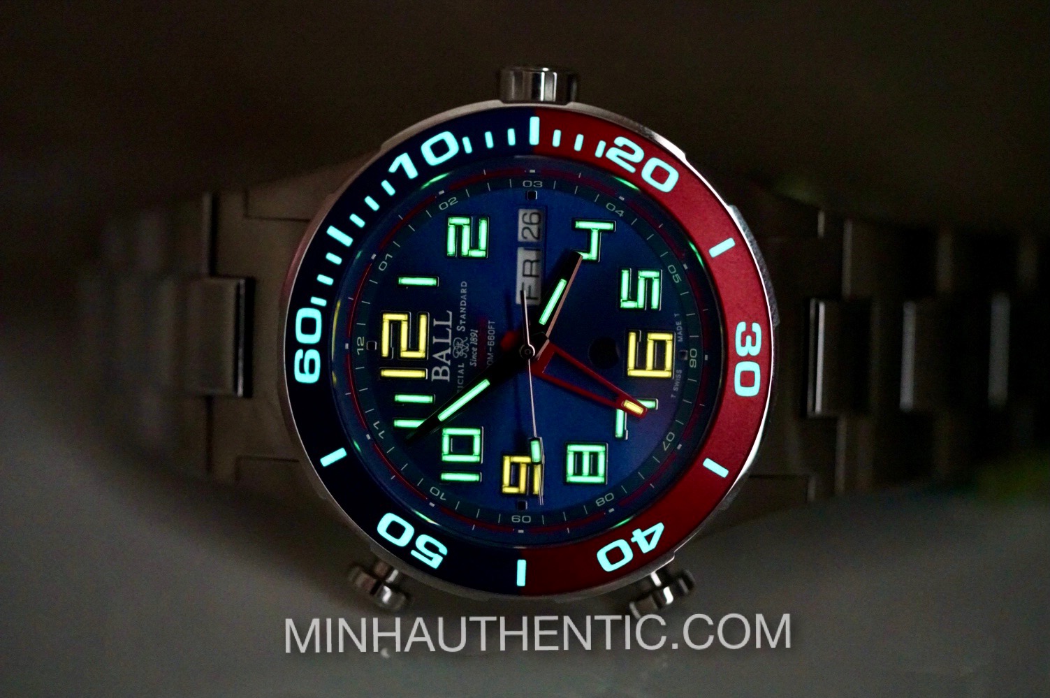Mặt số xanh đánh tia với bộ kim cọc số làm rất sắc nét, và chứa đựng điểm đặc trưng thú vị của Ball: đó là các ống phát quang chứa Tritium gas. Tritium là một chất phóng xạ có chu kì bán rã là 12.32 năm, nhưng rất an toàn, người ta đã tính là lượng Tritium ở 40000 chiếc Ball cộng lại cũng không đủ để gây hại gì. Ở các số 6-9-12 và kim GMT là các ống phát màu vàng, còn lại là màu xanh. Ngoài ra, các số và vạch số trên niềng lại được phủ dạ quang thông thường. Tritium sẽ sáng đều liên tục, còn dạ quang thì cần “sạc” ánh sáng trước để phát sáng.