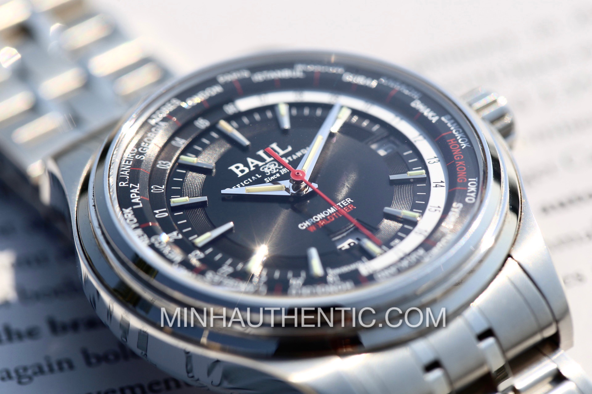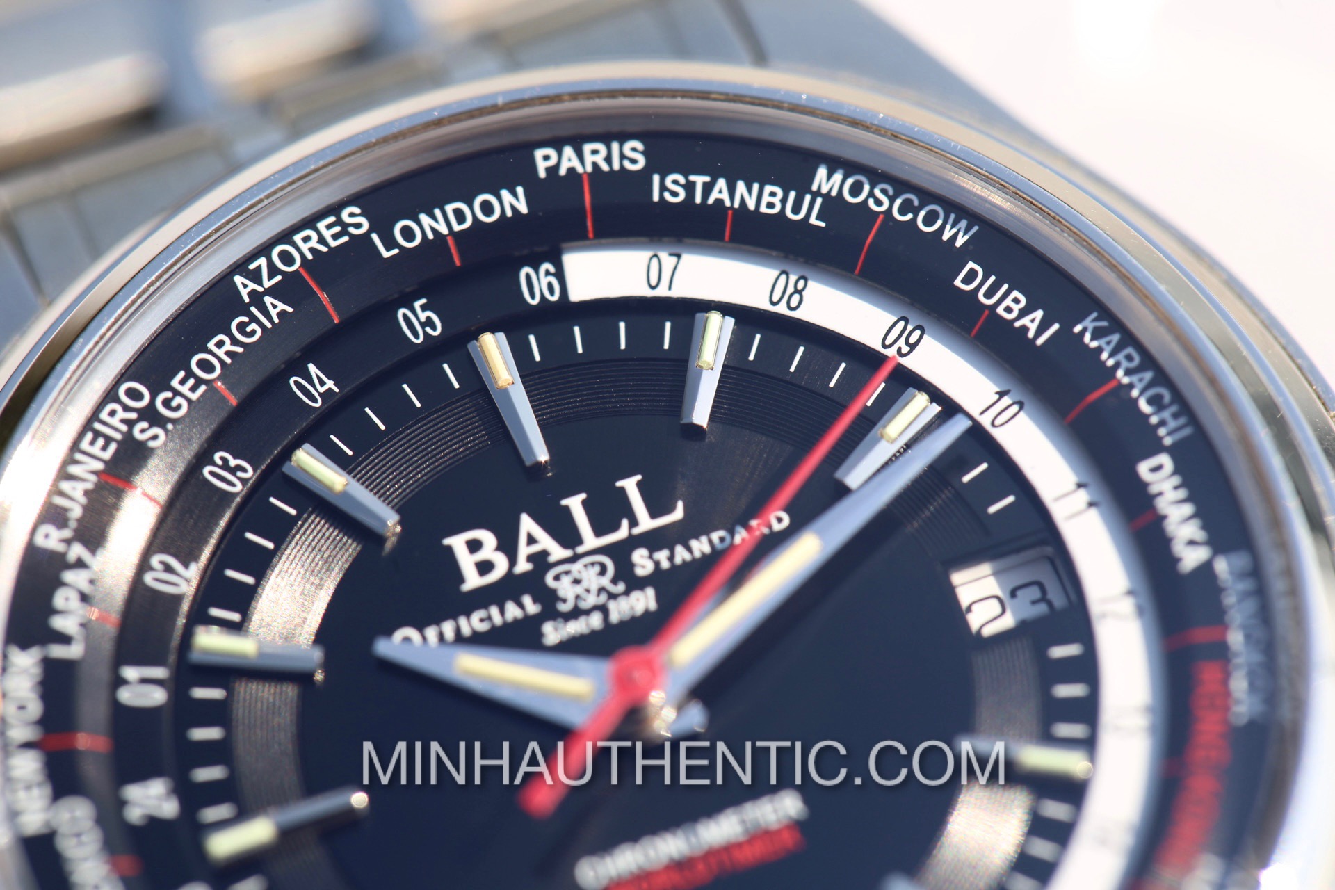 BỘ MÁY: Đây là bộ máy Worldtimer thực thụ, vì có vòng 24h di chuyển đồng hộ với kim giờ chính để theo dõi thời gian các múi giờ. Và một điểm đặc biệt nữa là bộ máy này được nâng cấp để có chức năng nhảy lịch ngay lập tức như của đồng hồ Rolex. Thông thường ở các đồng hồ khác, kể cả nhiều hãng cao cấp, khi đến khoảng 11h-11h30, ô lịch bắt đầu di chuyển lệch đi, nhưng đến 12h mới nhảy hẳn. Điều này khiến cho việc xem ngày tại thời gian chuyển tiếp đó gặp khó khăn. Còn với chiếc Ball này, lịch vẫn đứng yên không xê dịch và đến đúng 12h là nhảy thẳng sang ngày mới, cùng lúc cả thứ và ngày.