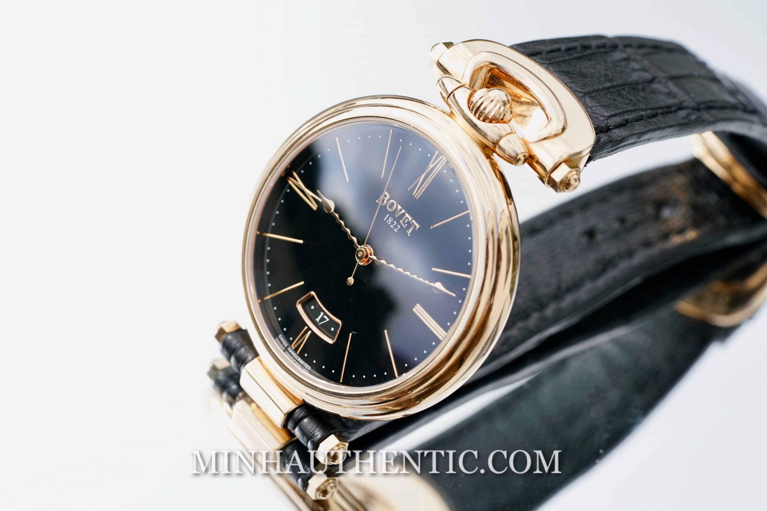 Đồng hồ nam Bovet Chateau de Motiers 40mm Black Automatic 18K Rose Gold HMS0012 với thiết kế đặc trưng dạng pocket watch. Mặt men đen bóng, kim và cọc số vàng hồng 18k