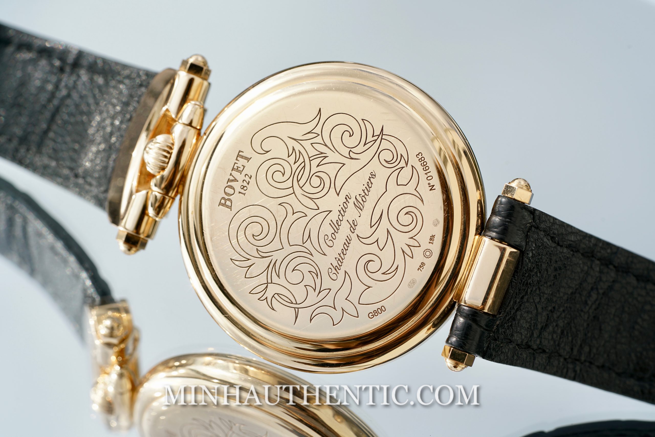 Ở chiếc Bovet Chateau de Motiers này, ta có thể thấy mặt số men đen bóng được nung qua lửa như truyền thống, bộ kim nung xanh được chế tác cầu kì. Logo “Bovet” được làm nổi và có bề mặt cong cũng rất tinh tế.