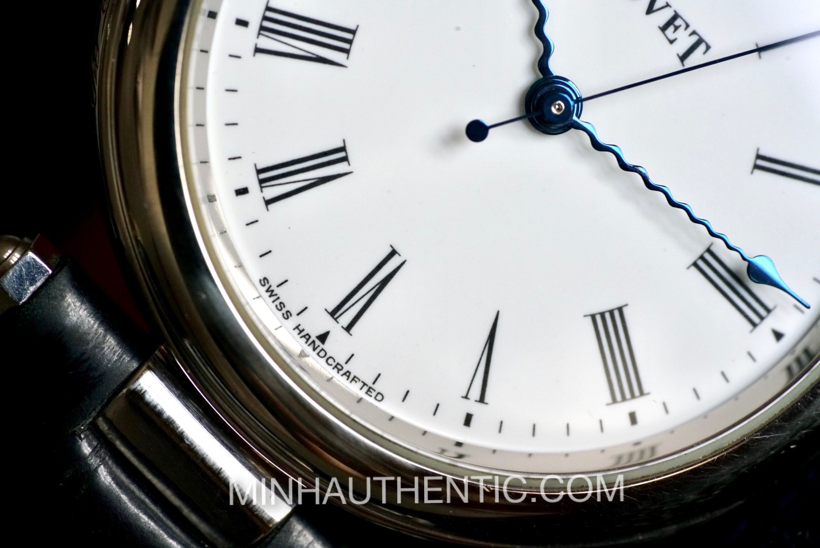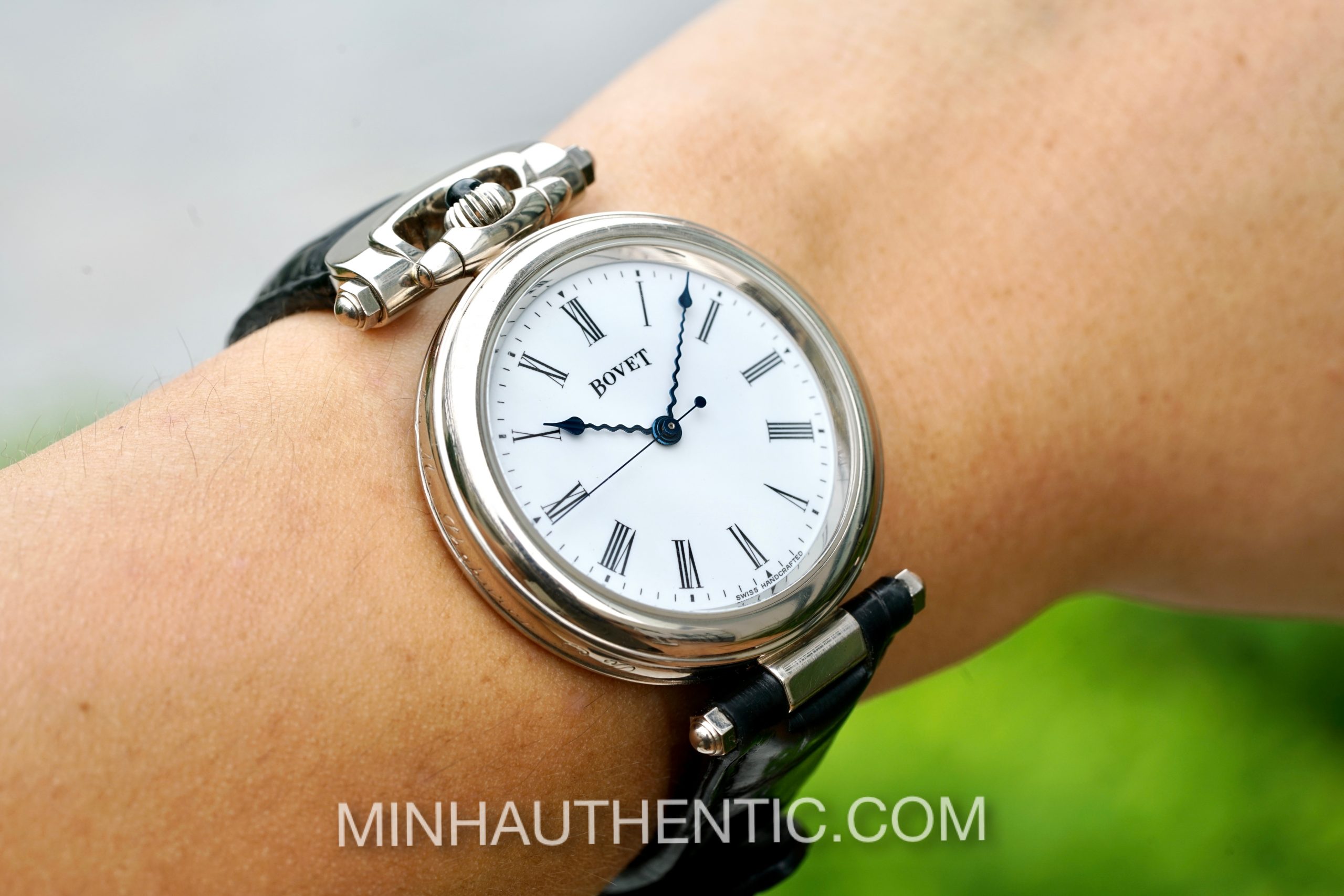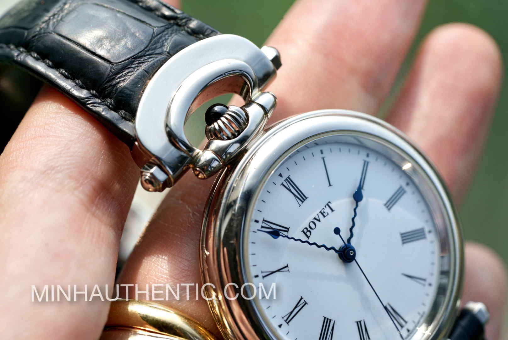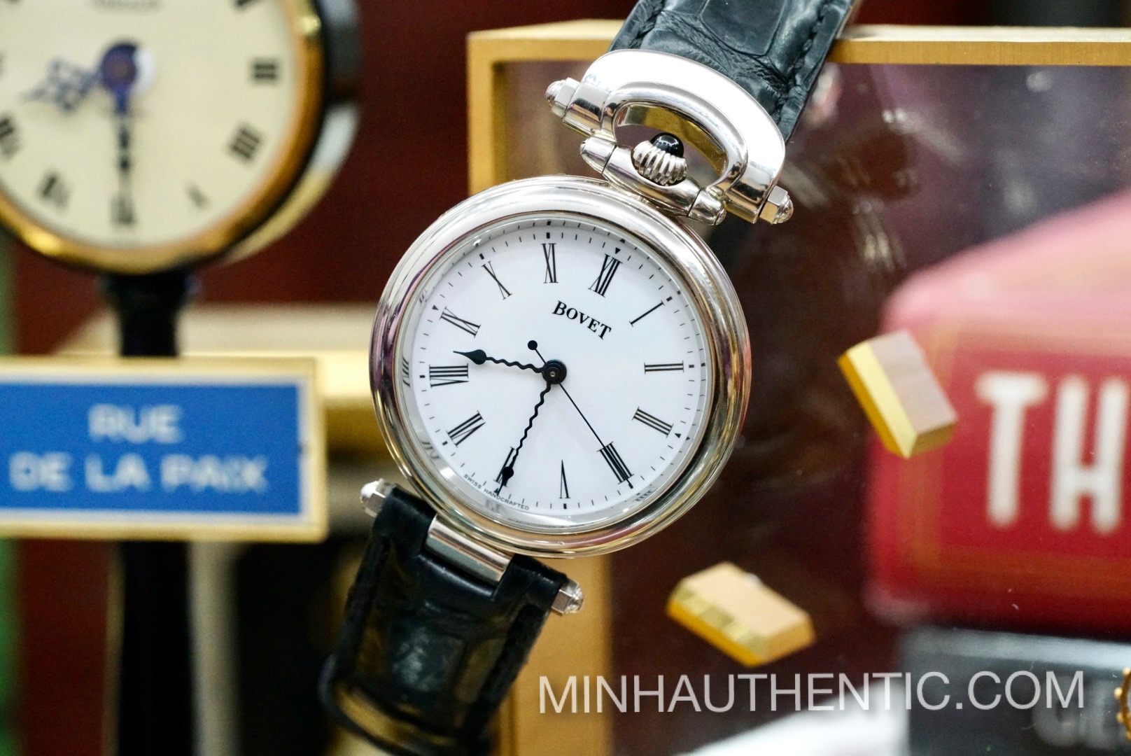 Đồng hồ nam Bovet Fleurier Automatic 18k White Gold 39mm với thiết kế đặc trưng dạng pocket watch. Mặt men trắng, kim nung xanh, rotor được chạm khắc thủ công.