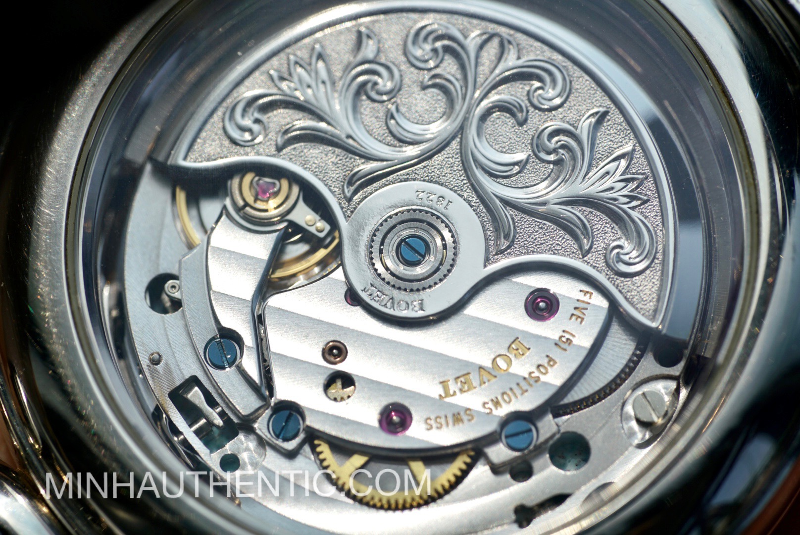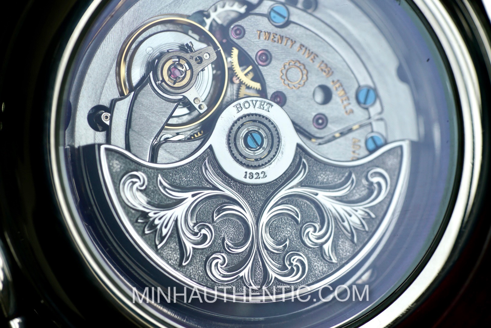 Như ở chiếc Bovet này, ta có thể thấy mặt số men trắng tinh được nung qua lửa như truyền thống, bộ kim được chế tác cầu kì và nung xanh, rotor bằng vàng trắng được chạm khắc thủ công tinh xảo, hay các chi tiết máy được bo cạnh thủ công (chamfering) từng góc một, rất mất thời gian và công sức.