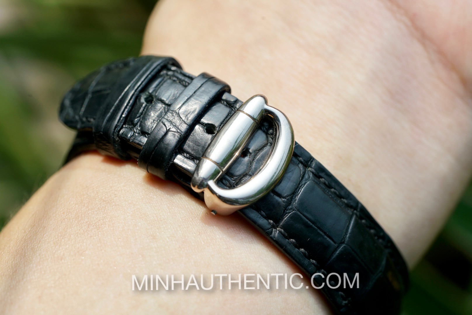 -DÂY: Da cá sấu đen nguyên bản, khoá gập vàng trắng 18k. 20-16mm