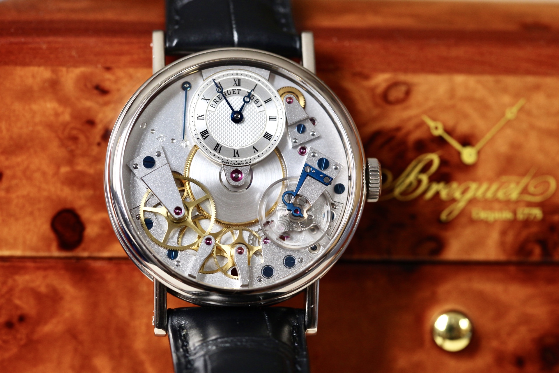 Đặc trưng của mặt số Breguet đó là, nó làm bằng vàng khối, được guilloche bằng phương pháp truyền thống như cách đây hàng trăm năm. Vì vậy, ở góc 6h ta có thể thấy dòng chữ “Swiss Guilloche Main”, tức là được guilloche thủ công tại Thuỵ Sĩ. Mặt số sau khi guilloche được mạ trắng bạc, in chữ và số, rồi phủ 1 lớp bảo vệ trong suốt. Bộ kim nung xanh nổi bật trên nền đen có hoạ tiết “clous de paris” đó.