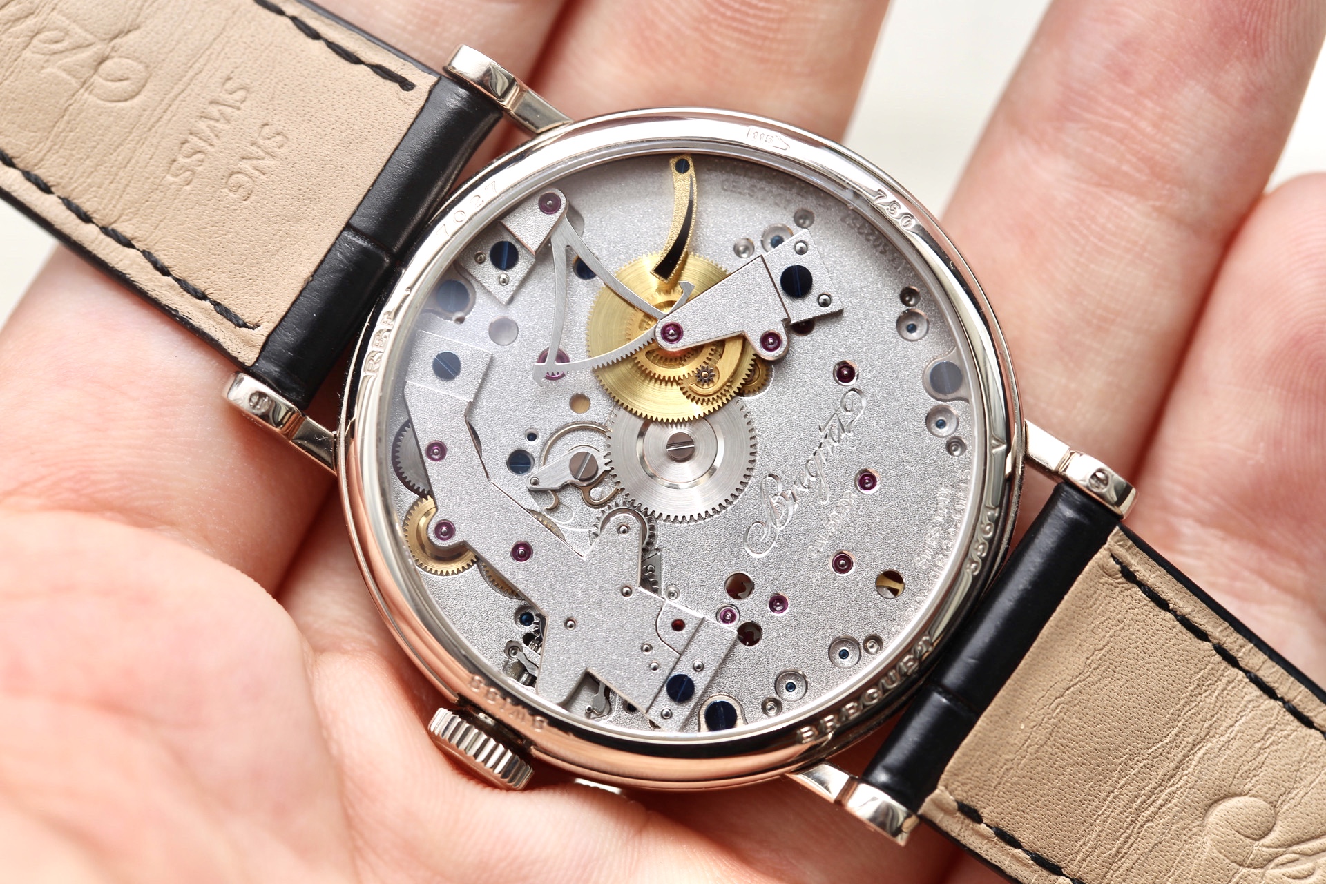 Lật mặt sau của chiếc Breguet Tradition 7027, ta có thể thấy các bánh răng của cơ chế nạp cót và đặc biệt là “kim xăng”.
