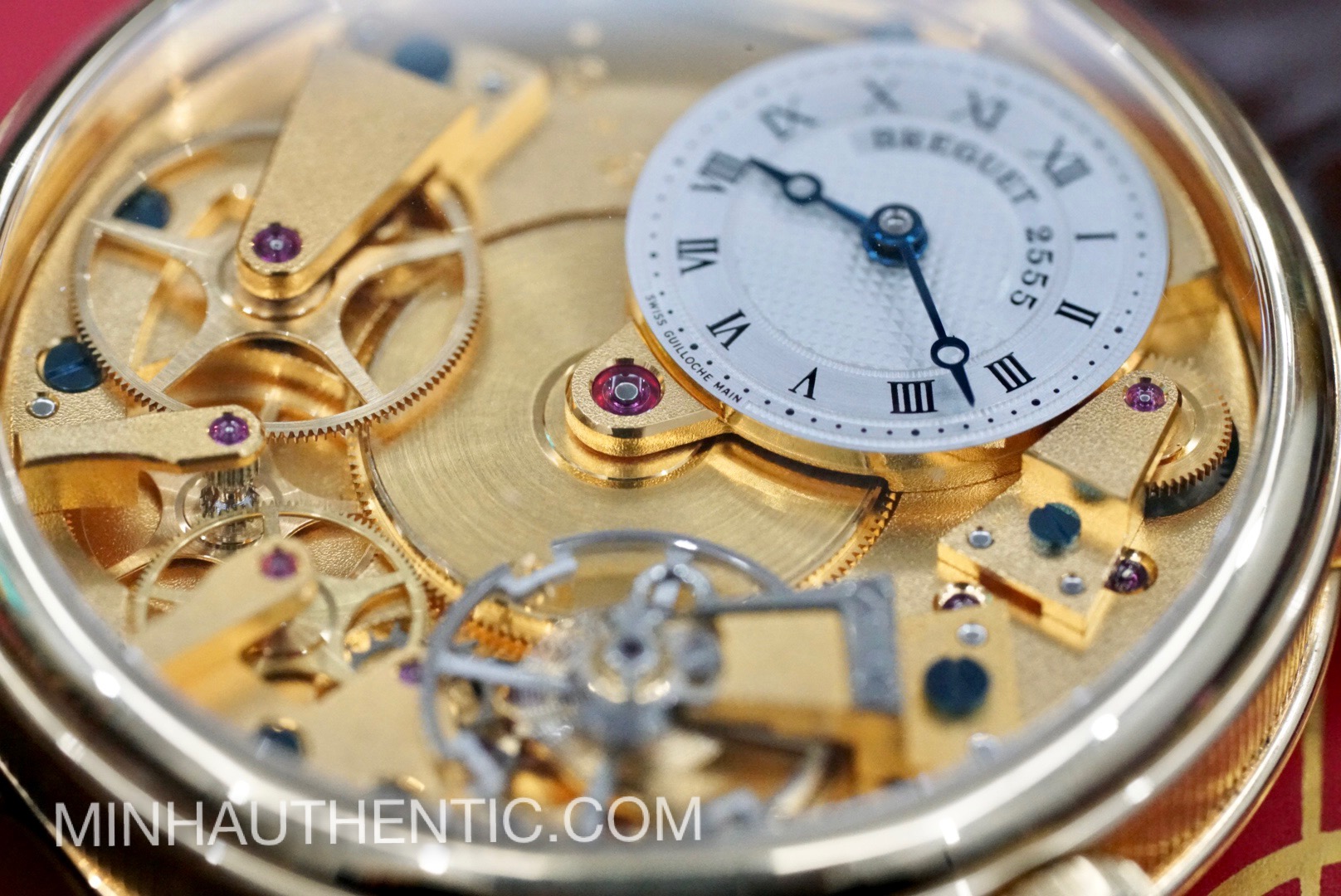 Giờ/phút được hiển thị bởi 2 kim nung xanh trong dial bằng vàng khối mạ bạc. Đặc trưng mặt số Breguet đó là nó làm bằng vàng khối, được guilloche bằng phương pháp truyền thống như cách đây hàng trăm năm. Vì vậy, ở góc 6h ta có thể thấy dòng chữ “Swiss Guilloche Main”, tức là được guilloche thủ công tại Thuỵ Sĩ.