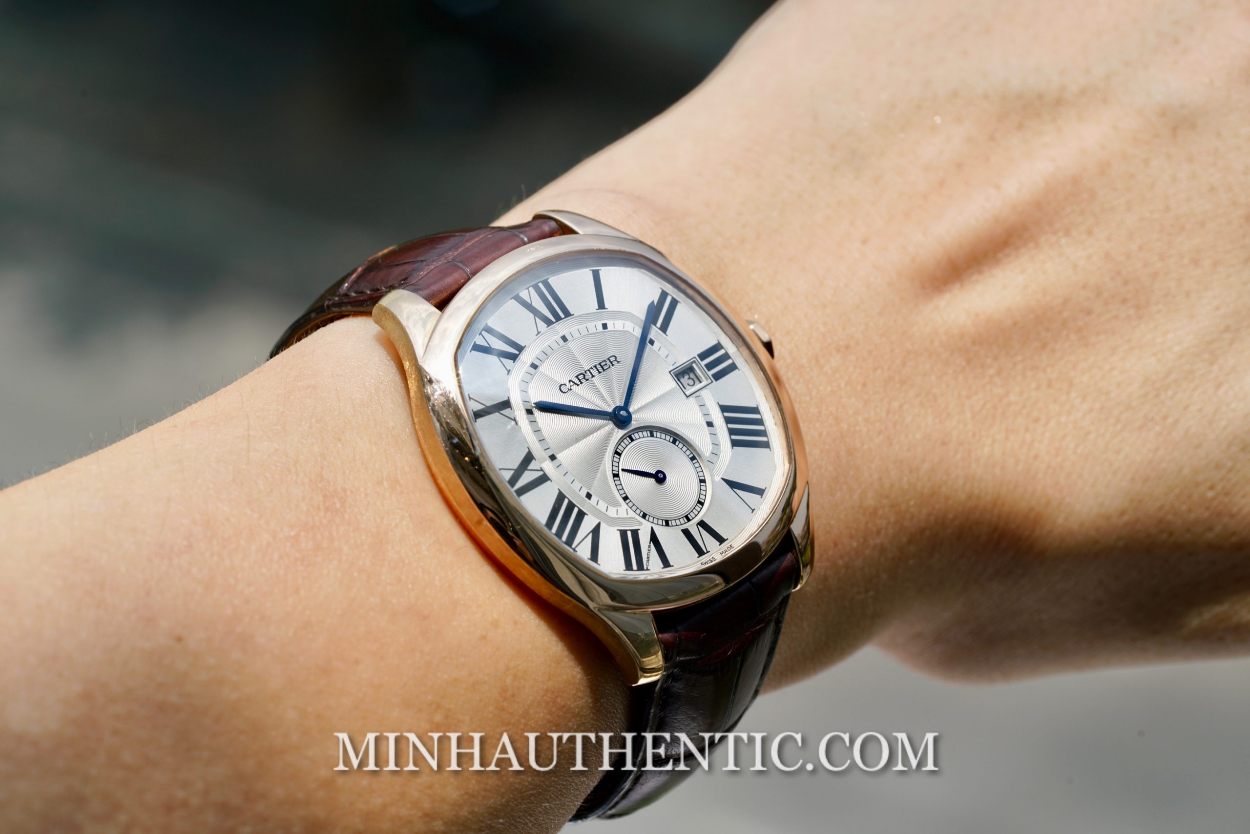 Khi lên tay, chiếc Drive thể hiện ngay rằng nó là 1 chiếc đồng hồ nam với các góc cạnh. Nhưng nó lại vừa tinh tế đúng chất Cartier, với các đường cong mềm mại đến từ kính, càng, và cạnh bên. Thông thường, với 1 chiếc đồng hồ dạng “Cushion” thế này, sẽ có cảm giác to hơn thông số, ví dụ 1 chiếc 40 sẽ to như 42-43. Tuy vậy, chiếc Drive lại khá là “true to size”, có lẽ do “lug to lug” chỉ 46.5mm, và cong ôm lấy cổ tay người đeo. Vậy nên cổ tay bé cỡ 15.5cm vẫn có thể đeo khá thoải mái.