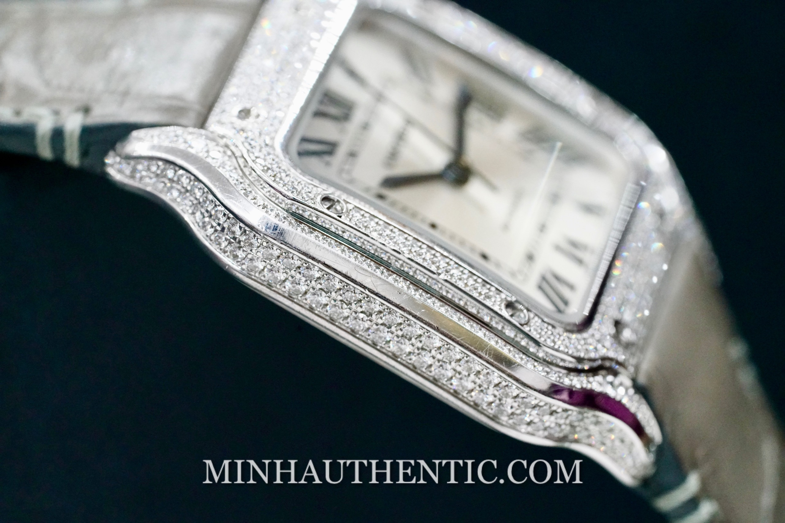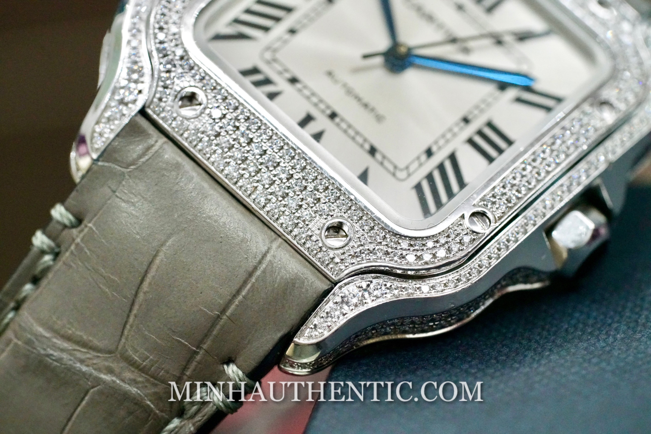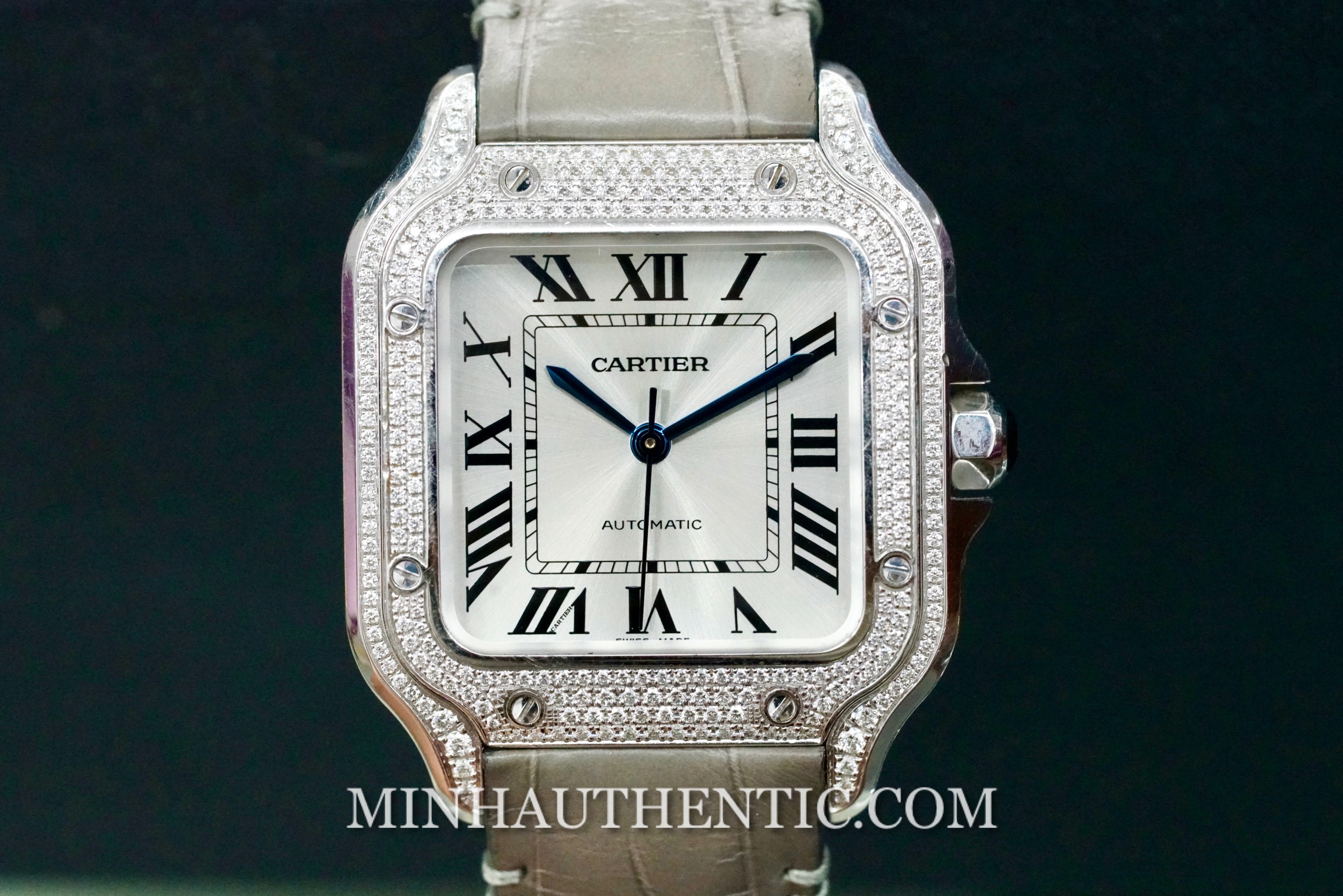 Đồng hồ Cartier Santos Medium Diamond 18k White Gold WJSA0014 thế hệ mới, đính kim cương nguyên bản rất hiếm gặp.