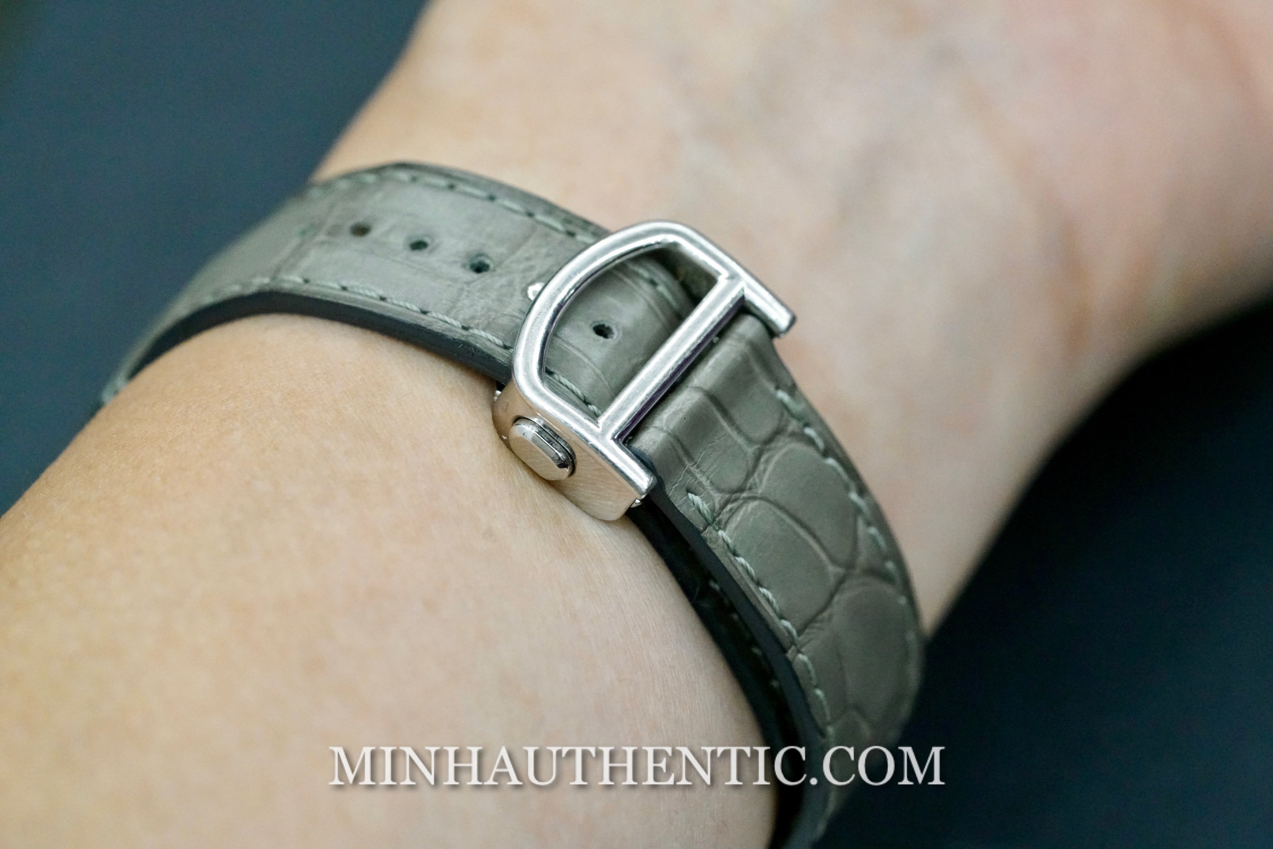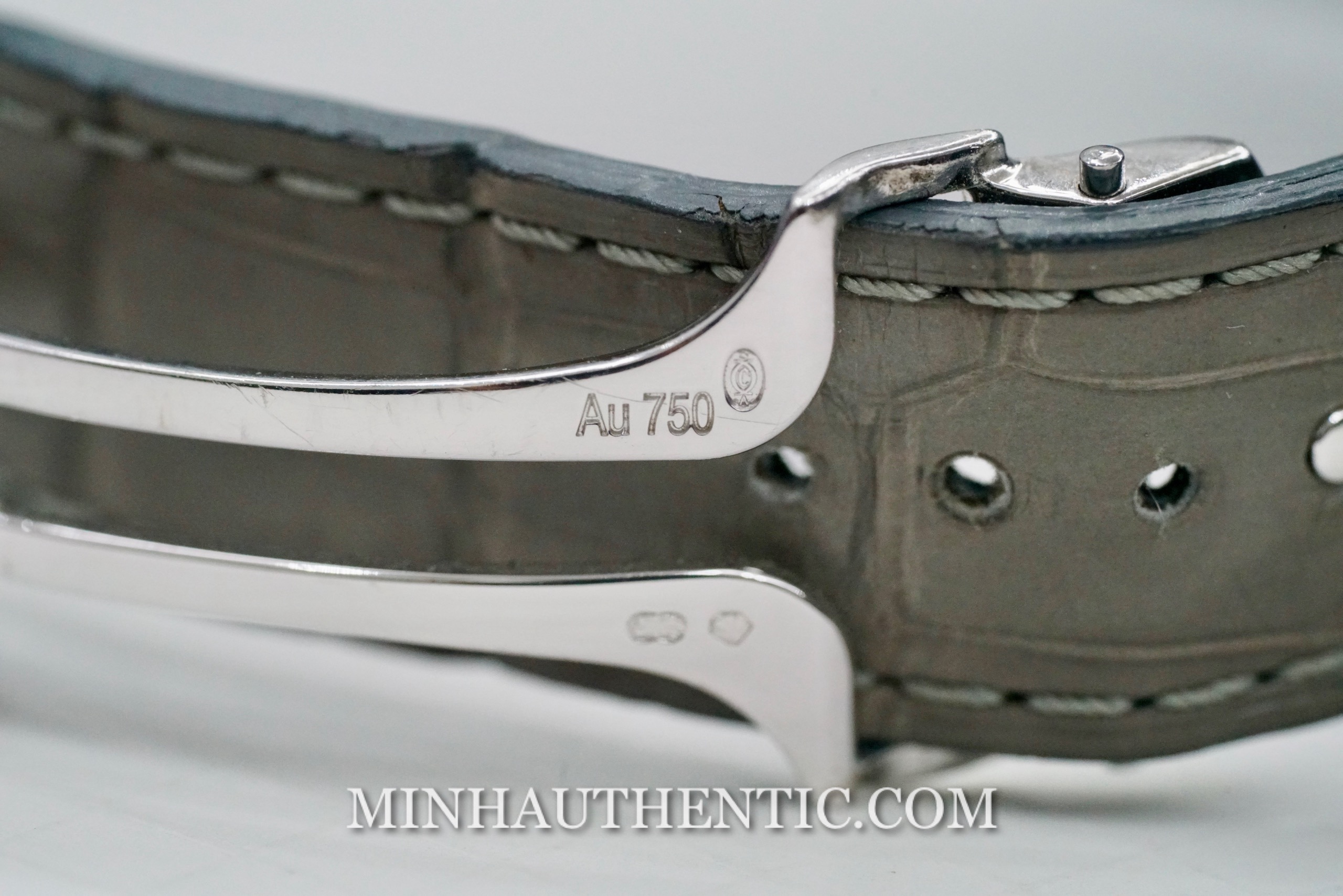 -DÂY: Da cá sấu nâu nguyên bản, khoá gập vàng trắng 18k. 18-16mm