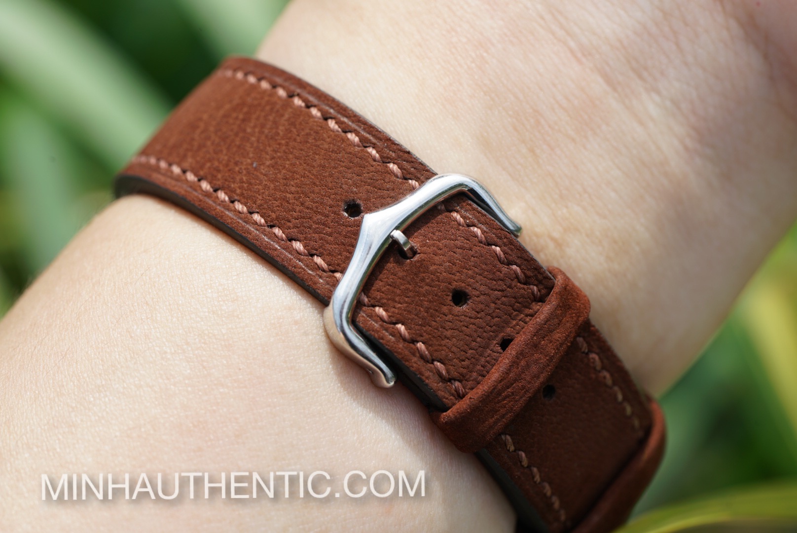 -DÂY: Da cá sấu nguyên bản + 1 bộ Da nubuck nâu và da Epson xanh thay mới, khoá cài vàng trắng 18k zin. 18-18mm
