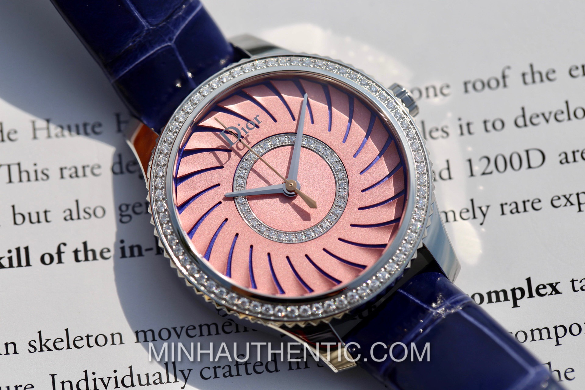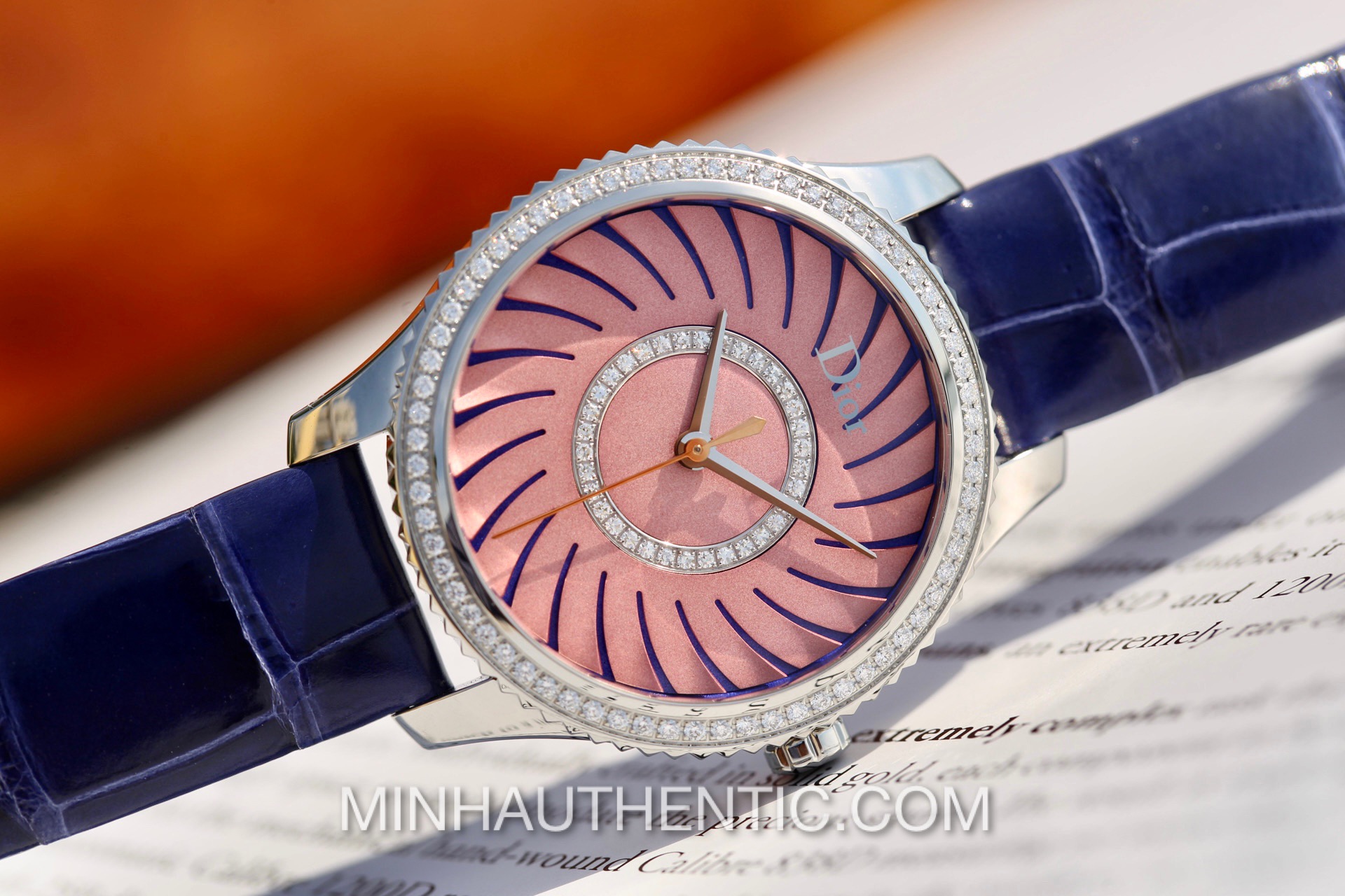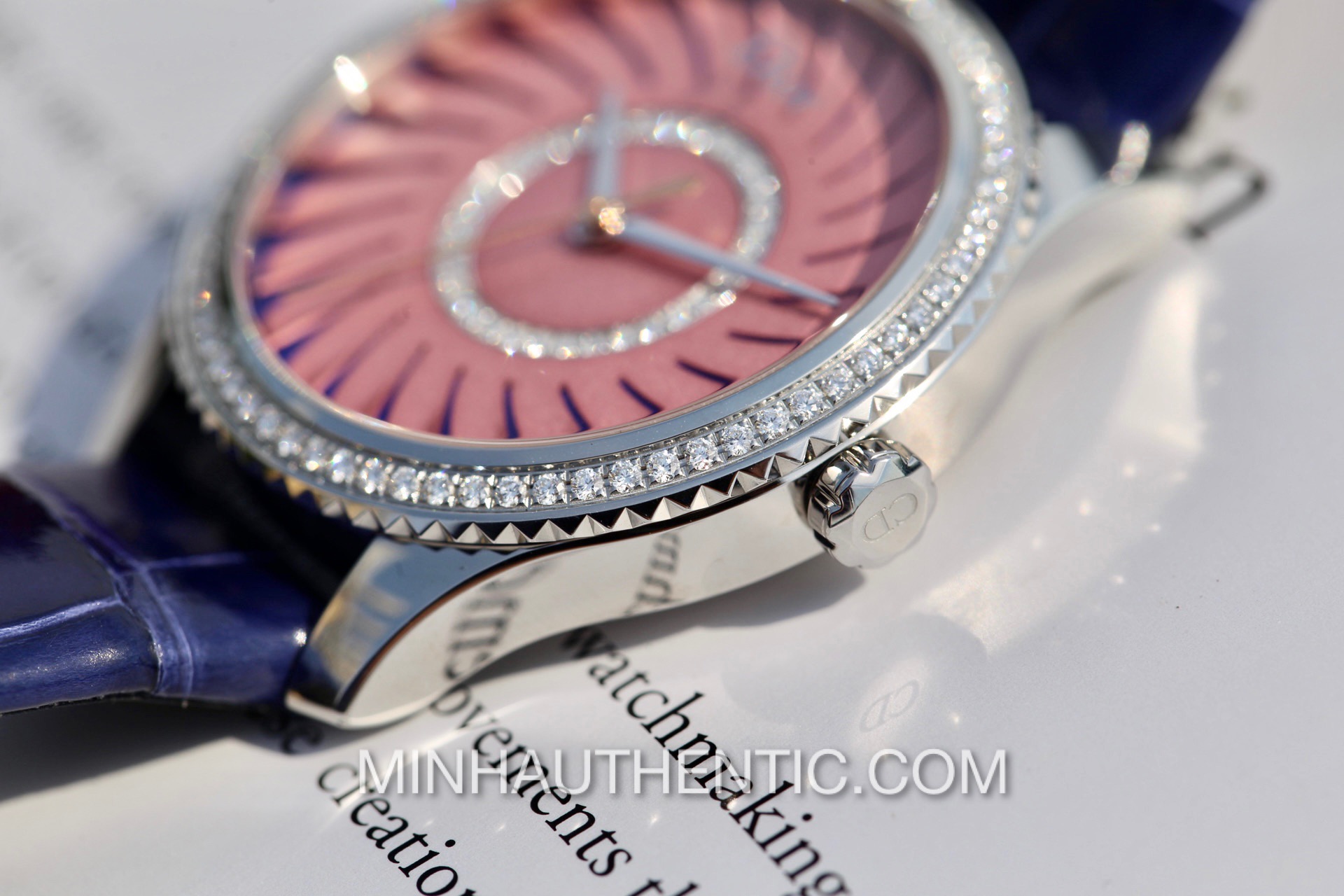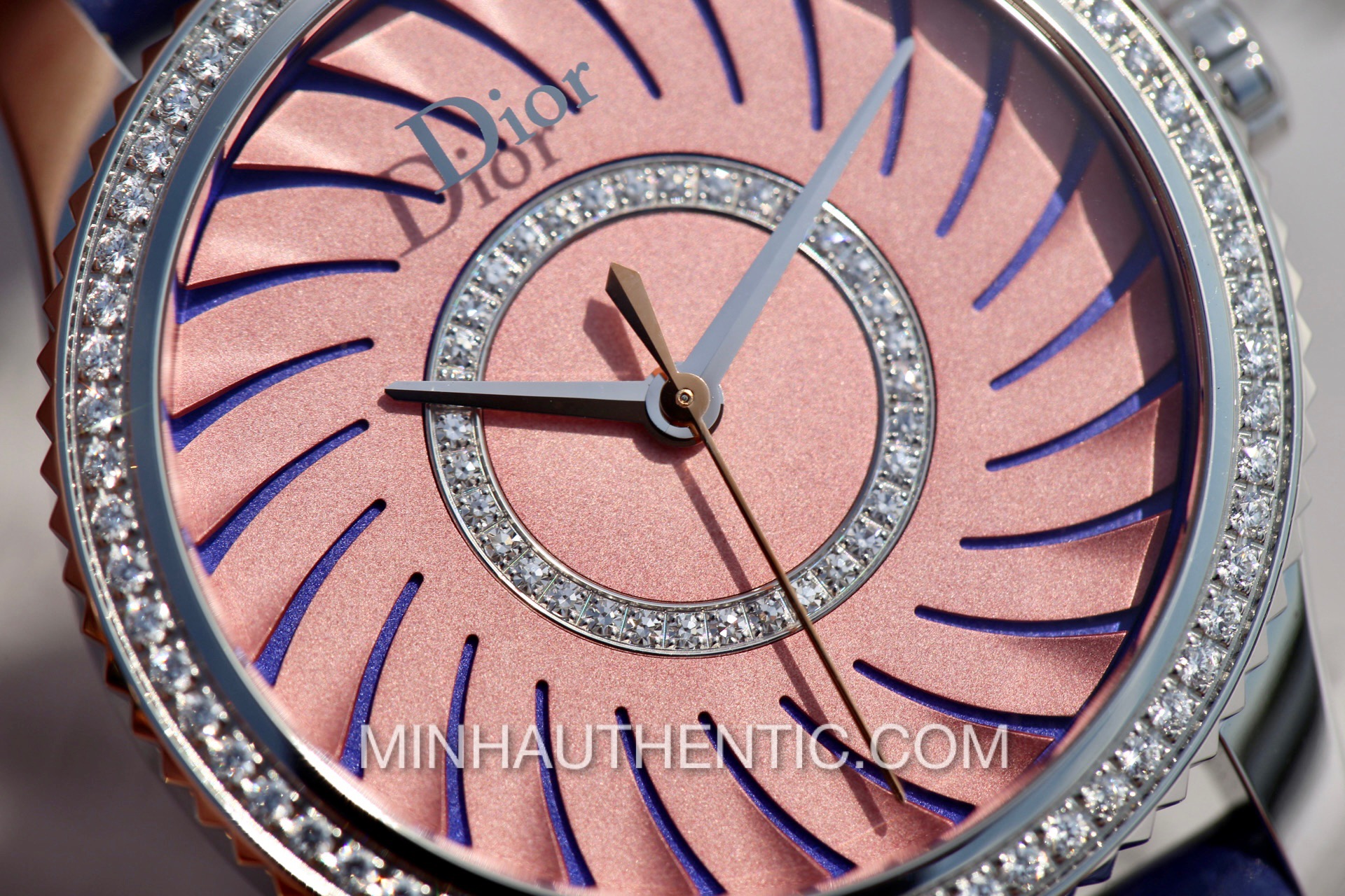 Đồng hồ nữ Dior VIII Montaigne CD152113A001 với mặt số và niềng được đính kim cương zin từ hãng rất đẹp. Dial xẻ rìa 3D rất độc đáo.
