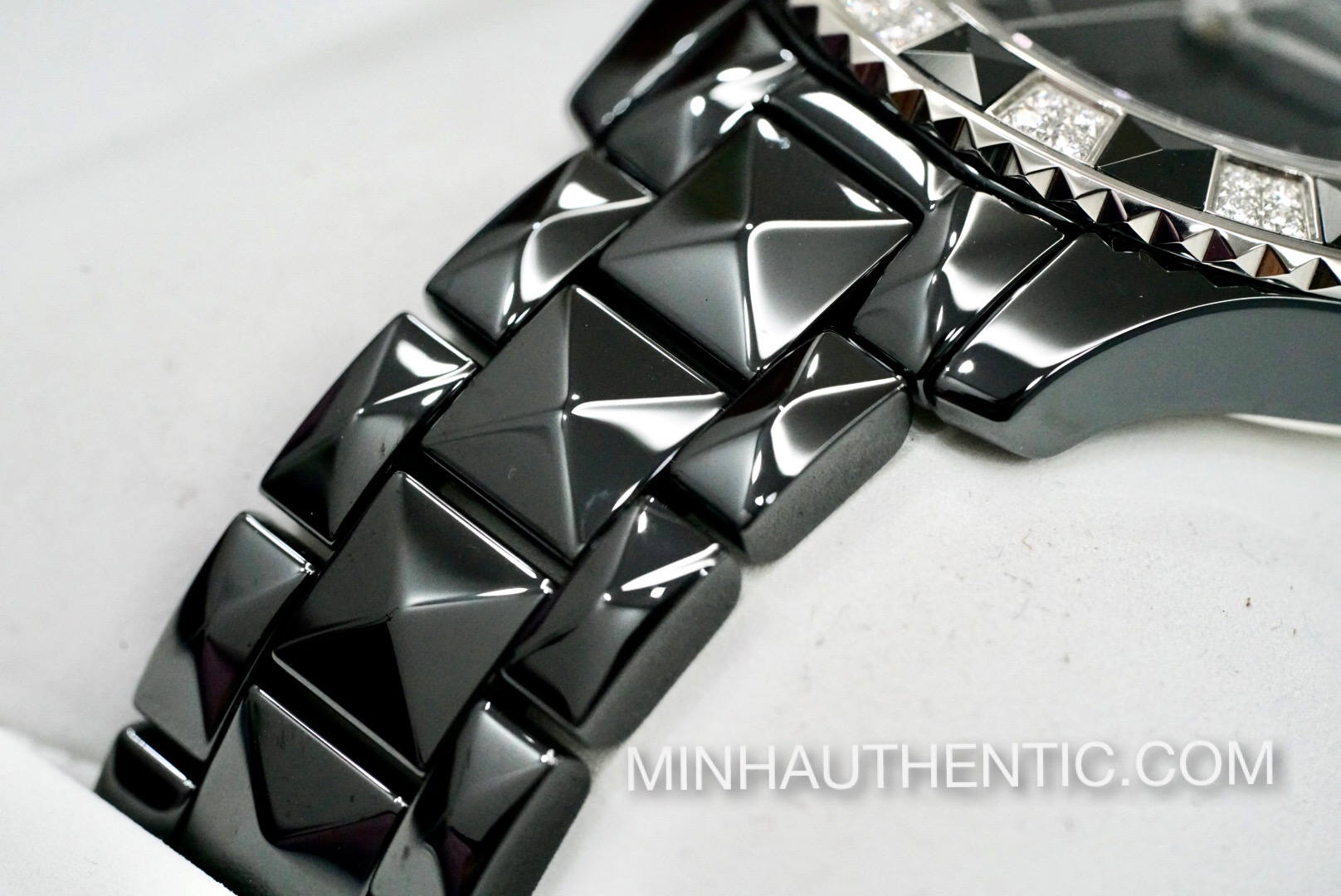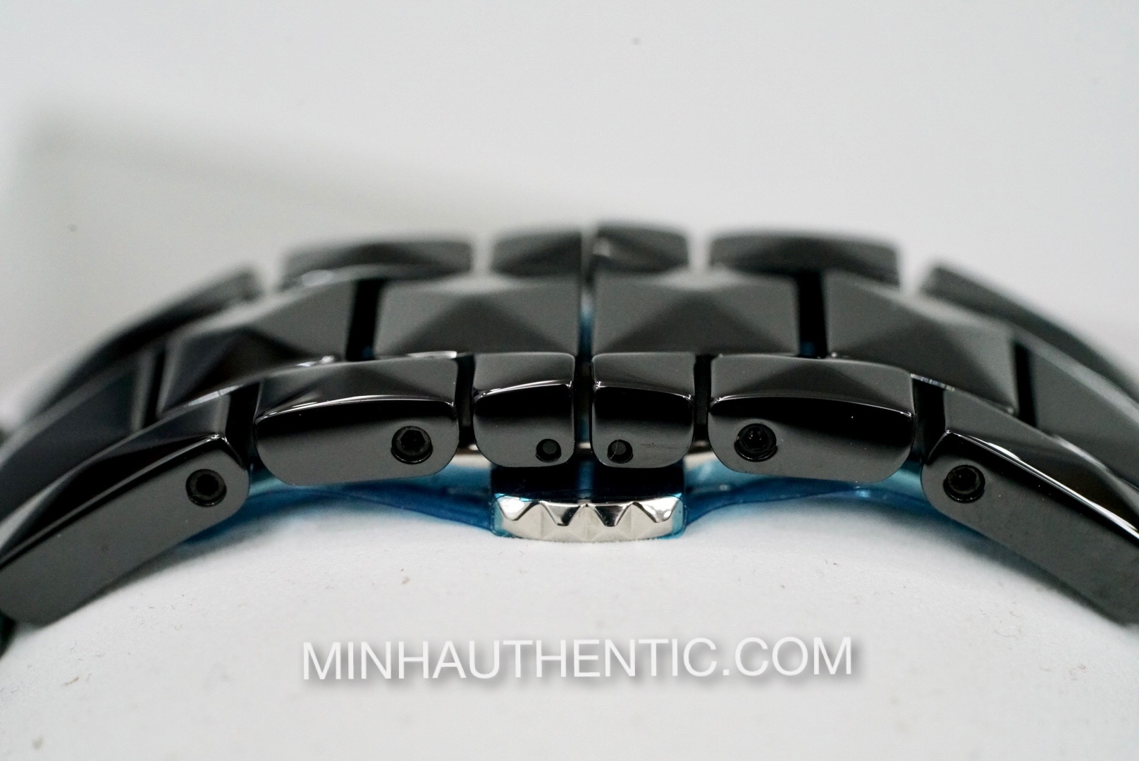 Vỏ và dây cũng được làm bằng ceramic đen, đem đến độ chống xước gần như 99%, vậy nên đồng hồ có thể nhìn vẫn như mới sau hàng năm sử dụng. Mắt dây cũng được cấu tạo bởi 3 mảnh nhỏ, đều lồi lên tạo thành hình kim tự tháp rất đẹp mắt. Khi lên tay, mỗi khi cổ tay cử động dưới ánh đèn, các góc cạnh trên mỗi chi tiết và kim cương đều phản xạ lại ánh sáng bên ngoài, tạo nên hiệu ứng lấp lánh trên cổ tay rất sang trọng.