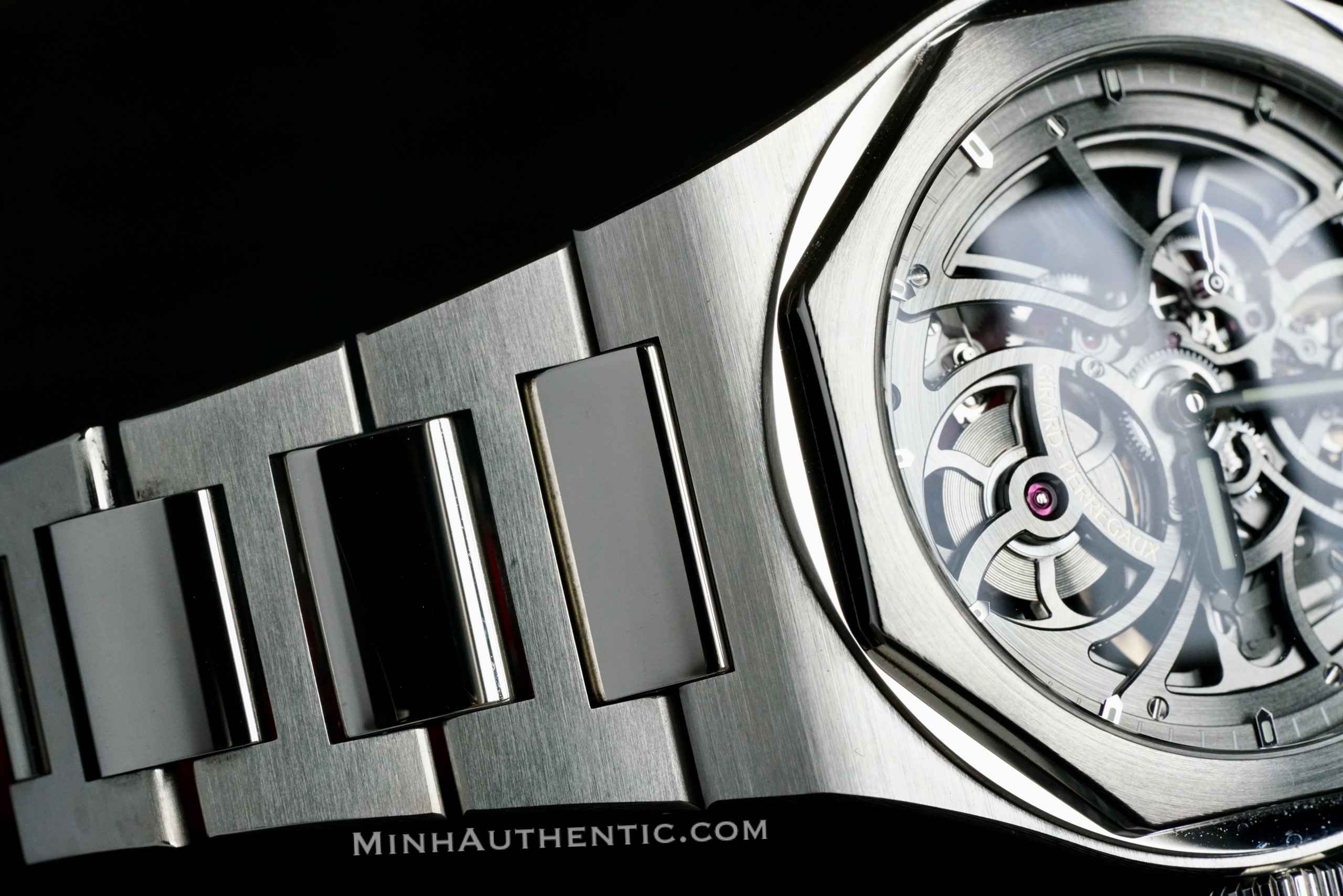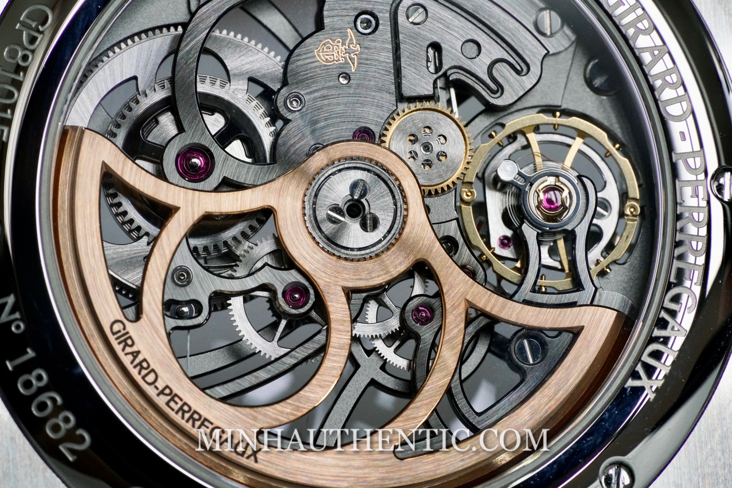 -MÁY: GP 1800 Skeleton, mạ xám, cót 54h. Vành tóc dạng “Free-sprung” với 6 vít và 2 quả nặng mà chỉ bản skeleton này mới có, không có ở bản thường. Rotor bằng vàng hồng.