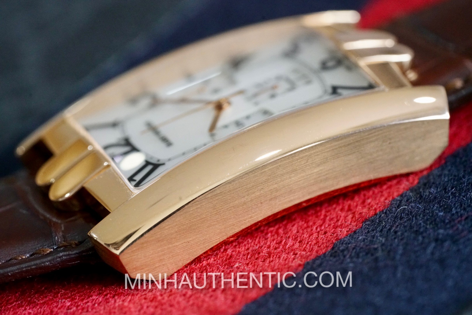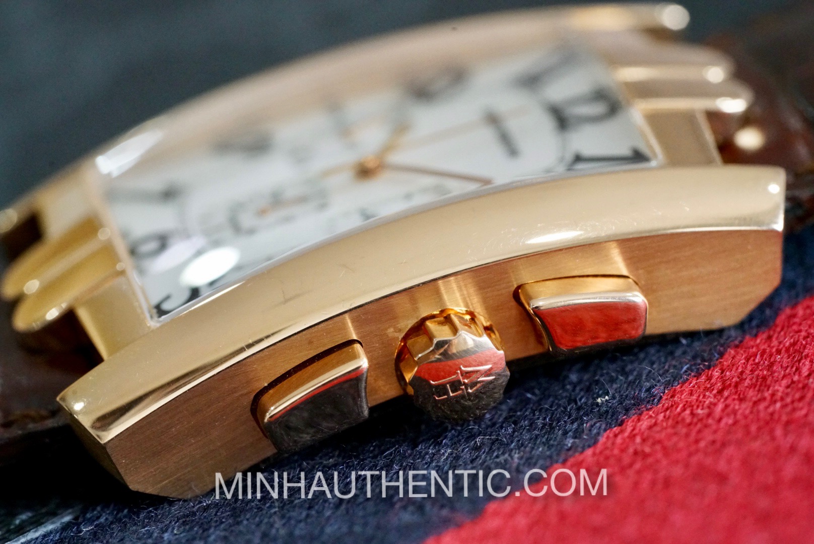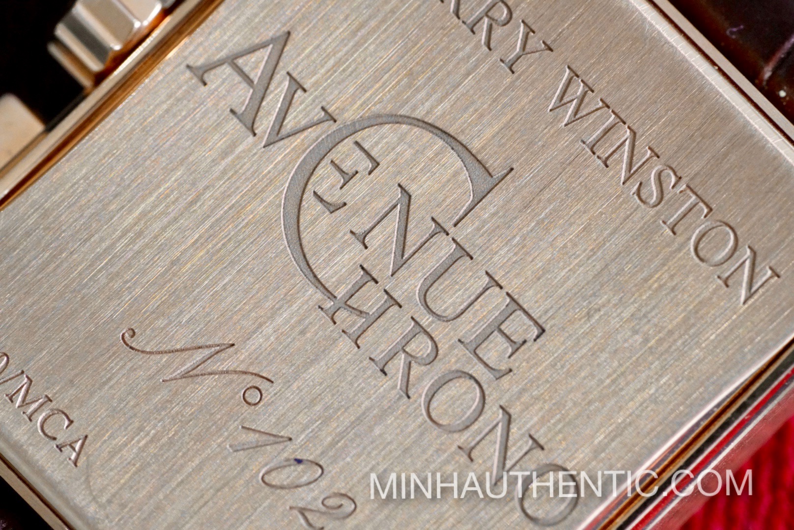 Với thiết kế có phần giống Cartier Tank, nhưng chiếc Avenue Chrono này lại có điểm đặc trưng của Harry Winston đó là 2 ngàm nhô ra ở góc 6 và 12h. Thân vỏ được làm bằng vàng hồng 18k, cho trọng lượng đầm chắc, được đánh bóng ở mặt trên và phay xước ở cạnh bên và đáy tạo sự tương phản sắc nét. Mặt số được làm bằng xà cừ trắng, với các số đen được kéo dài nổi bật và rất cân đối hài hoà. Đi kèm là dây da cá sấu nguyên bản, còn rất mới và khoá cài cũng bằng vàng hồng 18k