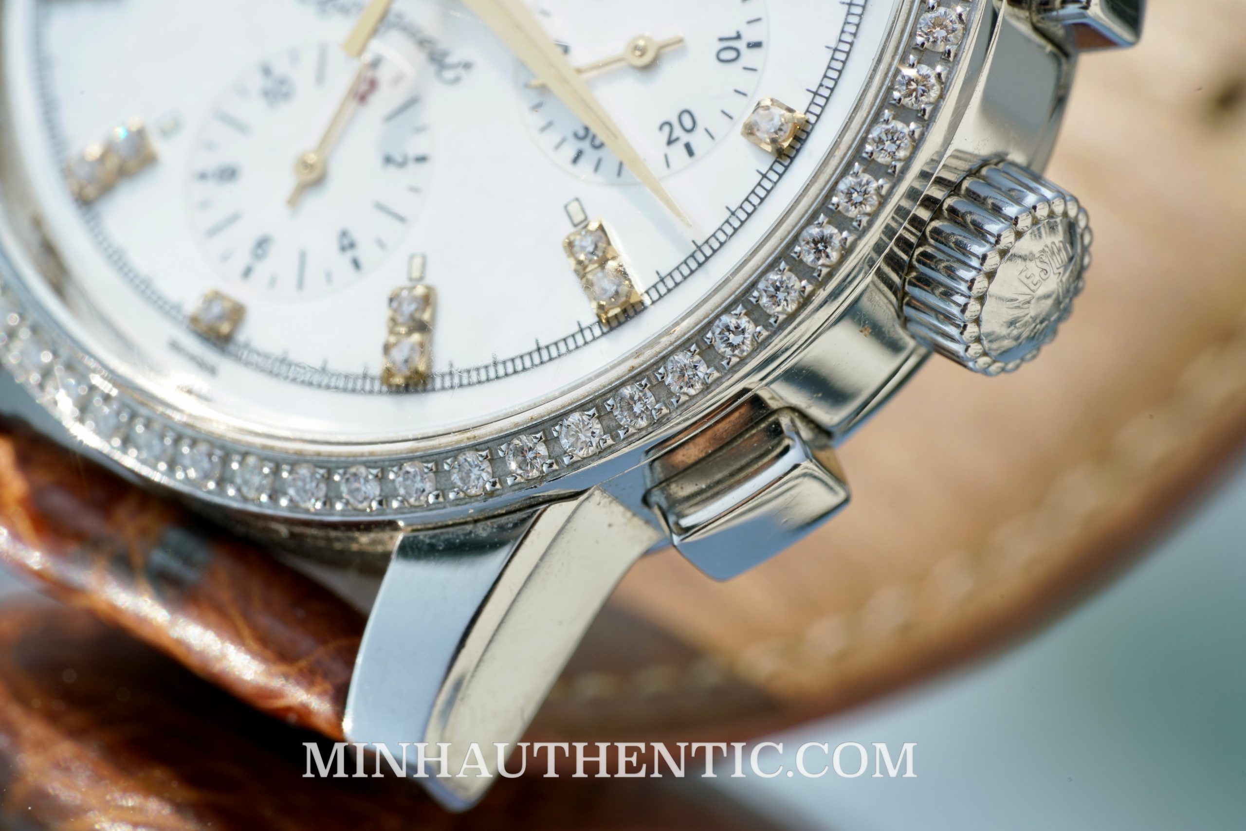 Conquest là dòng sản phẩm đặc trưng của Longines, với thiết kế rất hài hoà cân đối từ năm 1954. Mẫu L1.141.0.87.3 mà Minh Authentic đang có là phiên bản rất hiếm gặp, với toàn bộ niềng và cọc số được đính kim cương thiên nhiên nguyên bản từ hãng. Tình trạng còn rất mới, fullbox, trừ dây da zin đã hỏng do ẩm, được thay thế bằng dây da cá sấu mới.