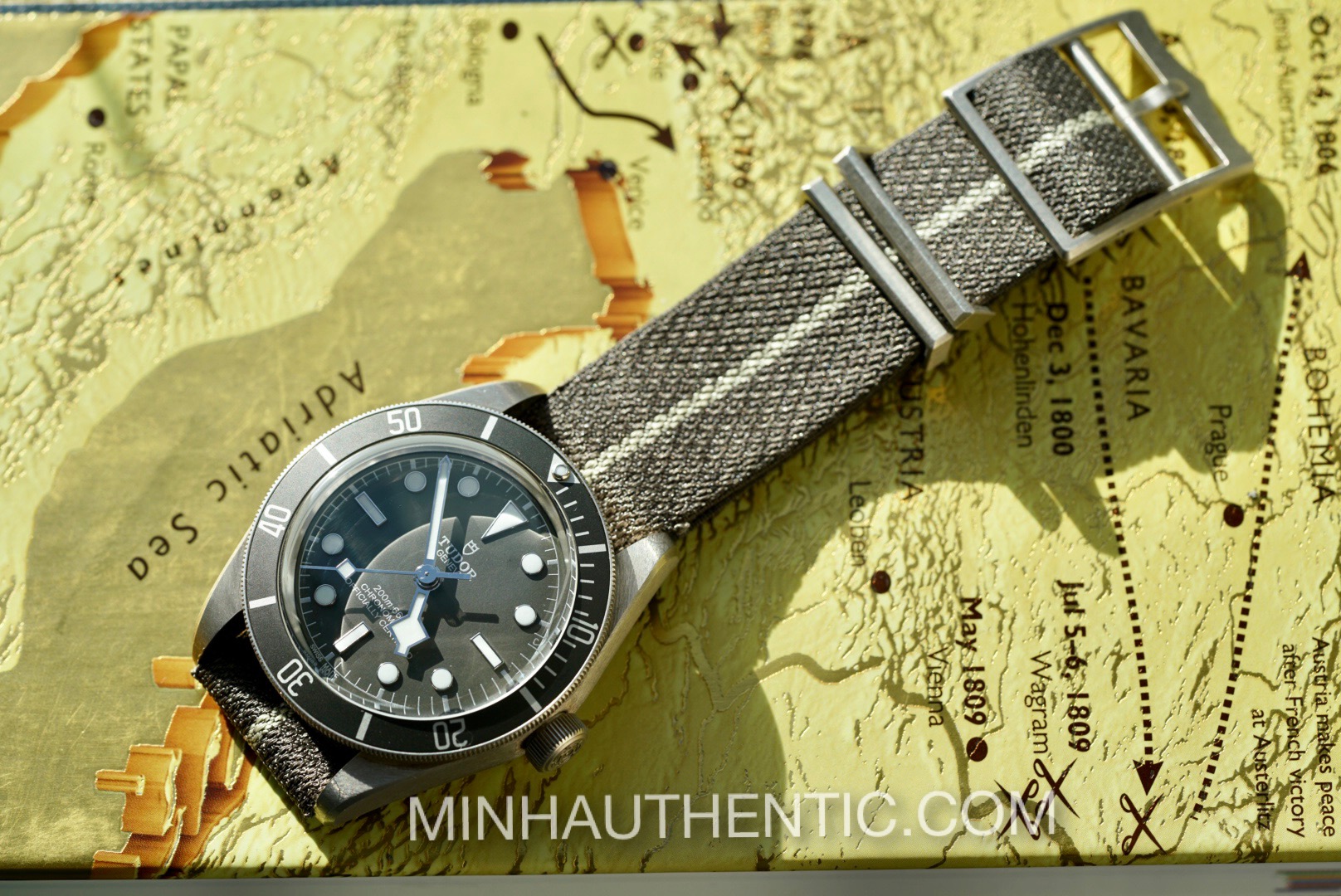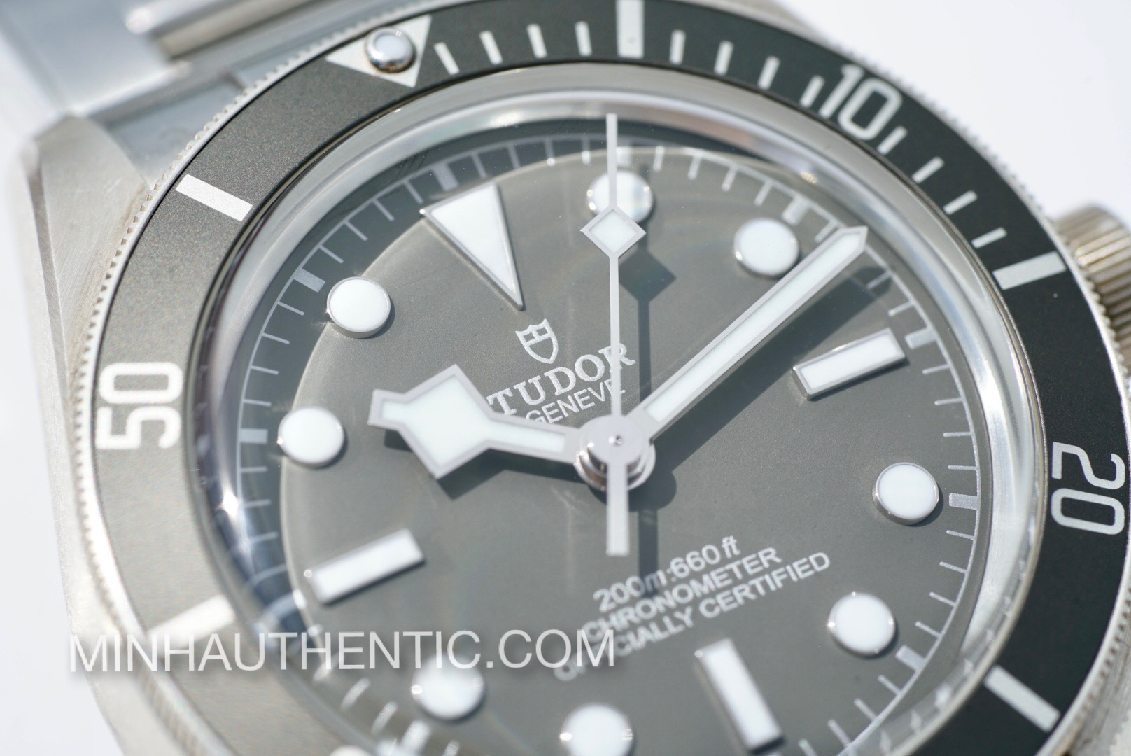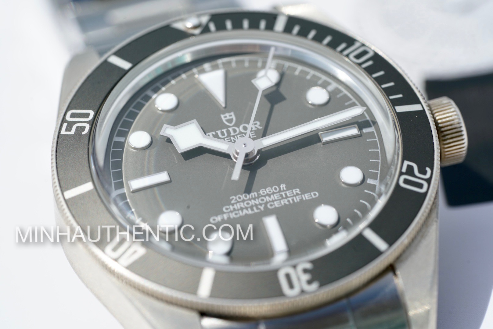 Về thiết kế, chiếc Black Bay 58 ref. 79010 này có giống như những chiếc Black Bay 58 khác: mặt số dạng “snowflake” đặc trưng, càng to khoẻ khoắn với đường vát cạnh tinh tế, niềng xoay diver. Tuy vậy, nó lại có sự khác biệt đáng kể về chất liệu và màu sắc. Toàn bộ vỏ và khoá được làm bằng bạc 925 (hợp kim chứa 92.5% bạc), cho một màu trắng ấm khá khác biệt, mà khi đặt cạnh vỏ thép sẽ thấy rằng thép có cảm giác xanh, lạnh hơn. Và chính sự khác biệt về màu sắc vỏ này, lại khiến cho màu sắc của mặt số và niềng là một sự lựa chọn hoàn hảo của Tudor. Ở tiếng Việt ta có thể gọi đây là màu xám, nhưng chính xác thì nó được gọi là “Taupe”, với hoàn thiện kiểu matte rất nhã nhặn và phù hợp với màu trắng ấm của bạc mà phải nhìn thực tế mới thấy rõ. Nếu kết hợp với vỏ là thép trắng xanh, thì có lẽ chiếc đồng hồ sẽ không có gì đặc sắc. Đi cùng với nó là bộ dây nato có màu tương đồng, rất mềm mại nhưng bền bỉ, được làm tại Lyon, Pháp bởi những máy dệt truyền thống có tuổi đời hàng trăm năm, và cũng cùng nhà sản xuất cho những hãng cao cấp như Chanel.
